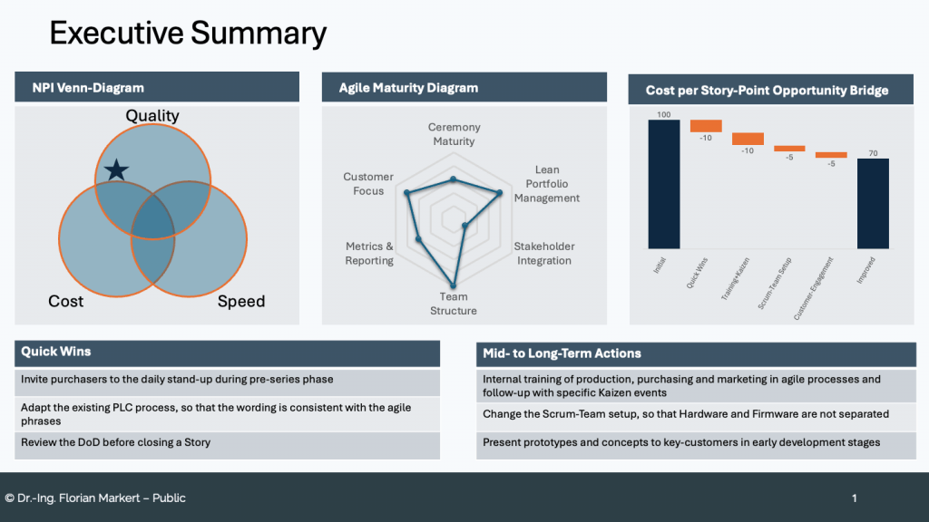 - Sie erhalten eine detaillierte Präsentation mit Executive Summary, die den agilen Reifegrad ihrer R&D-Organisation bewertet.