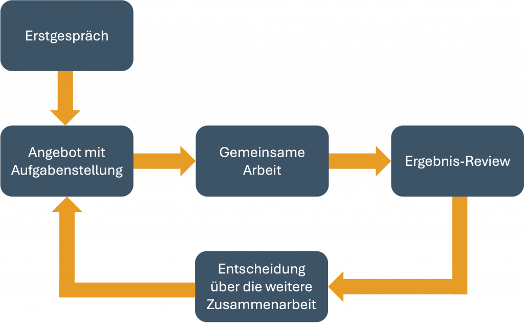 Unsere Zusammenarbeit wird in klar definierten Abschnitten strukturiert. Sie